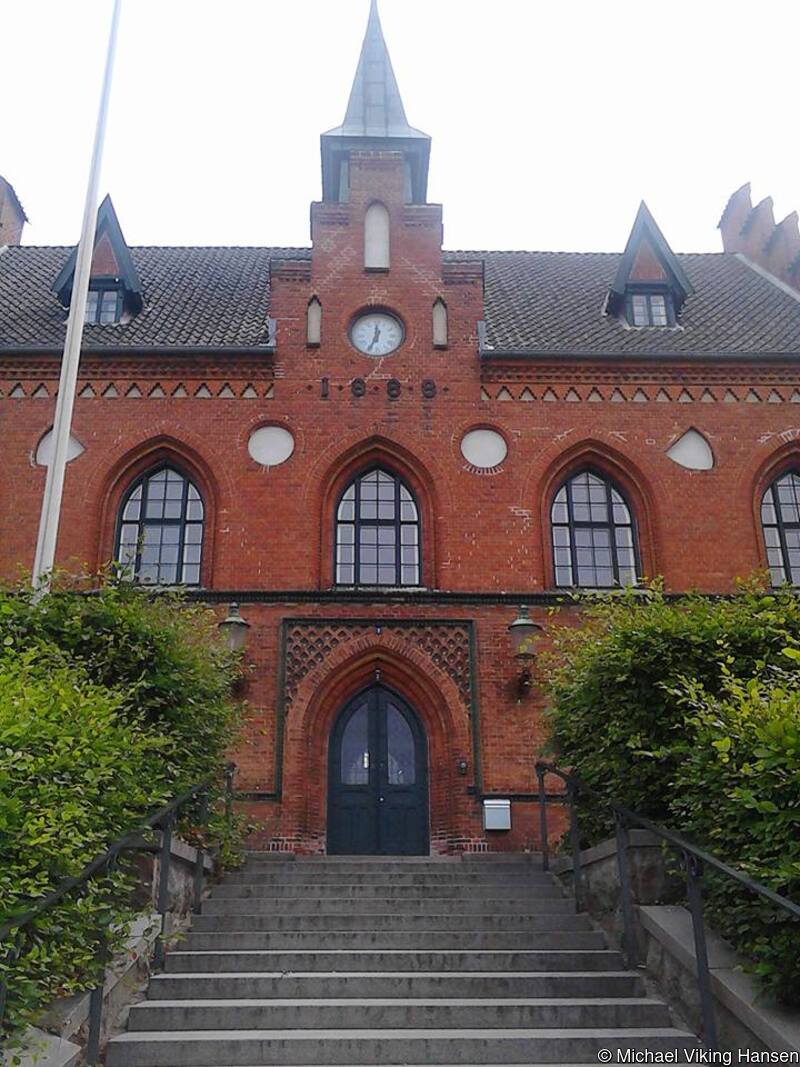 Øverste billede er hovedindgangen mod Torvet, som i tv-serien er indgangen til Korsbæk Rådhus. Det er her Agnes står og venter på sin brudgom (Røde).